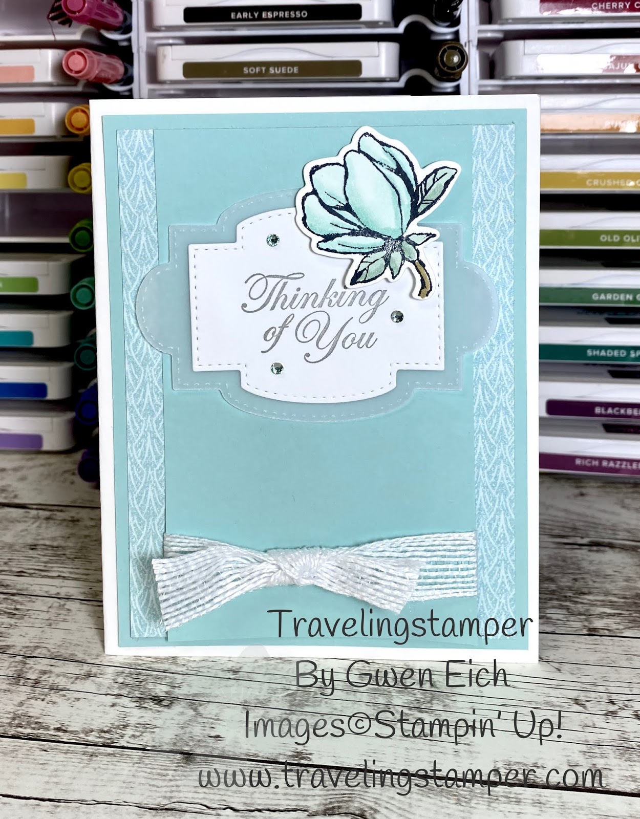 I just love the colors on this card. When I made this card I was thinking of one of my friends that has been on my mind lately. So I decided what a better way to let her know that I was thinking of her by sending her a card. Pool party has to be one of my favorite colors. Do you have a favorite Stampin’ Up! color?