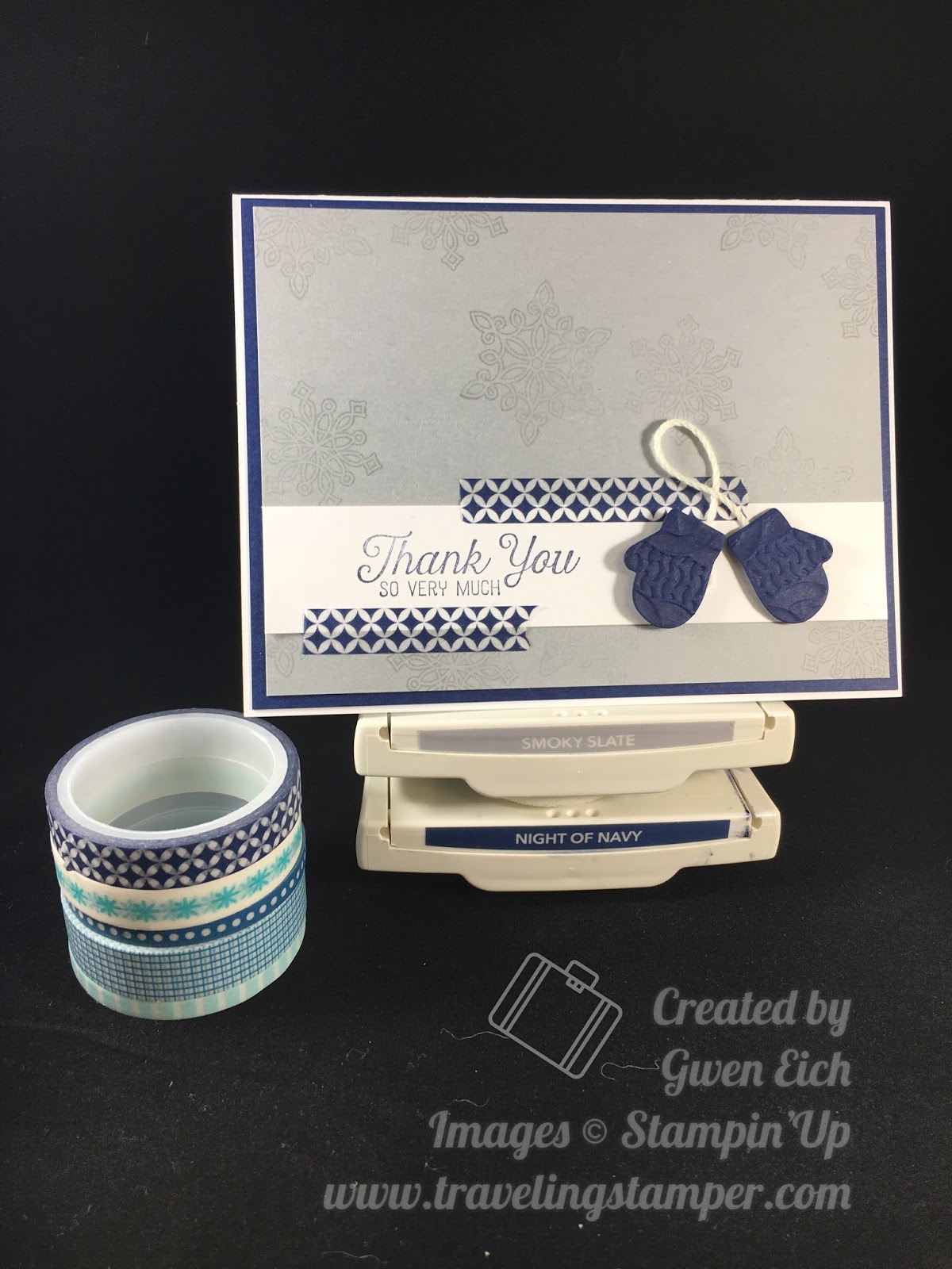 The background is stamped with smoky slate and I used Night of Navy on the greeting. Ran a piece of Night of Navy through the big shot using the cable knit embossing folder. Then I cut the mittens out with the Smitten Mittens die cut. At first, I put the mittens on plain but they were just missing something, this gives them just that little bit of texture I believe.