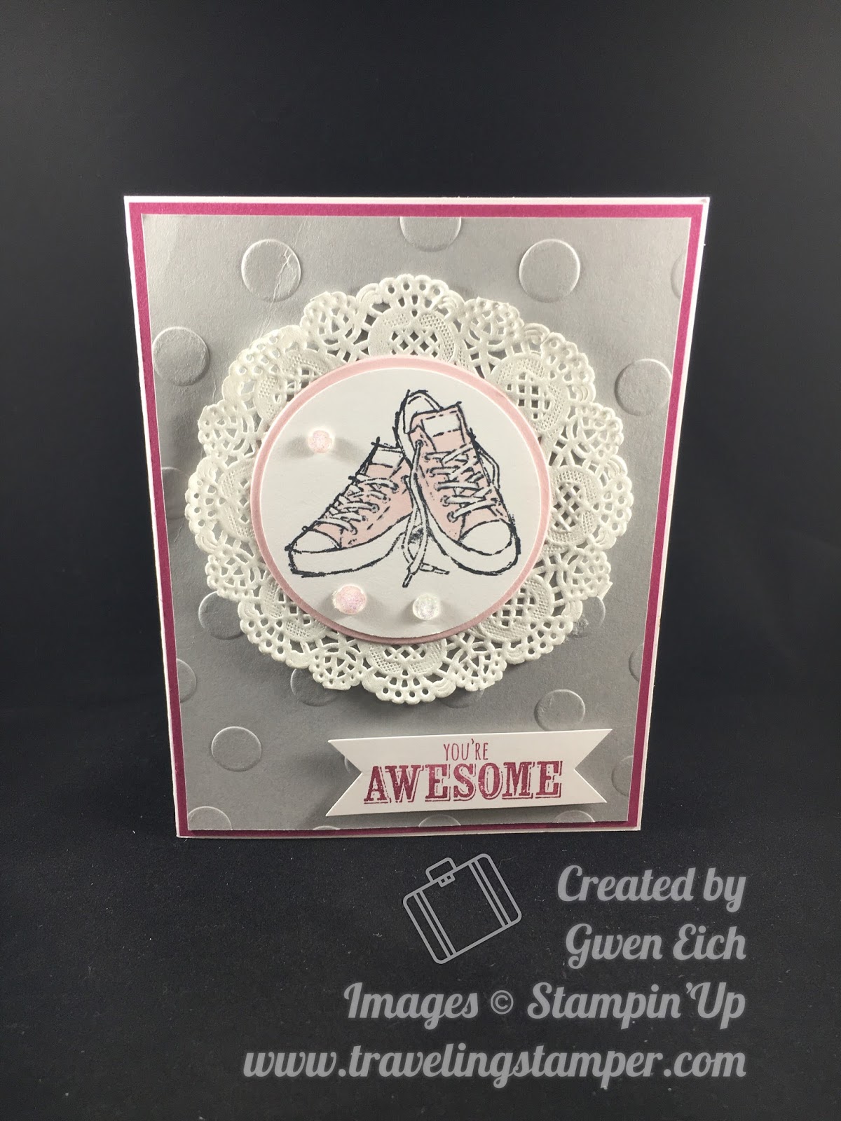 I don’t know why I felt this card needed a little lace. Most girls that where Converse are not girly but I will have to disagree. I mean have you seen brides wear them under their gown? You can’t beat a nice broken in pair of Converse. I had a purple pair that I loved as they had yellow shoe strings. I could wear them to the UNI (University of Northern Iowa) or to the Minnesota Vikings game. They were the best. But I finally had to get rid of them as the holes were too big and they were just too shameful looking. But after looking at this card I think I need a new pair of pink ones! Did you have a favorite pair? And if so what color were they?