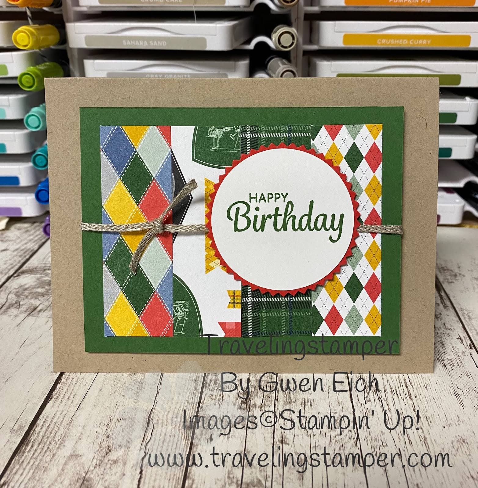 I was looking through my cards the other day and realized that I was short on masculine cards so decided I should start working on some. That way when the need arises, I have them ready to send. I started playing with the new Designer Series Paper (DSP) that is geared to the golfer. Let me tell you it doesn’t disappoint. Oh my, I just love all the designs on it. I made a ton of cards with this paper and decided to use up some of my scraps. Isn’t this a wonderful way to use them up?