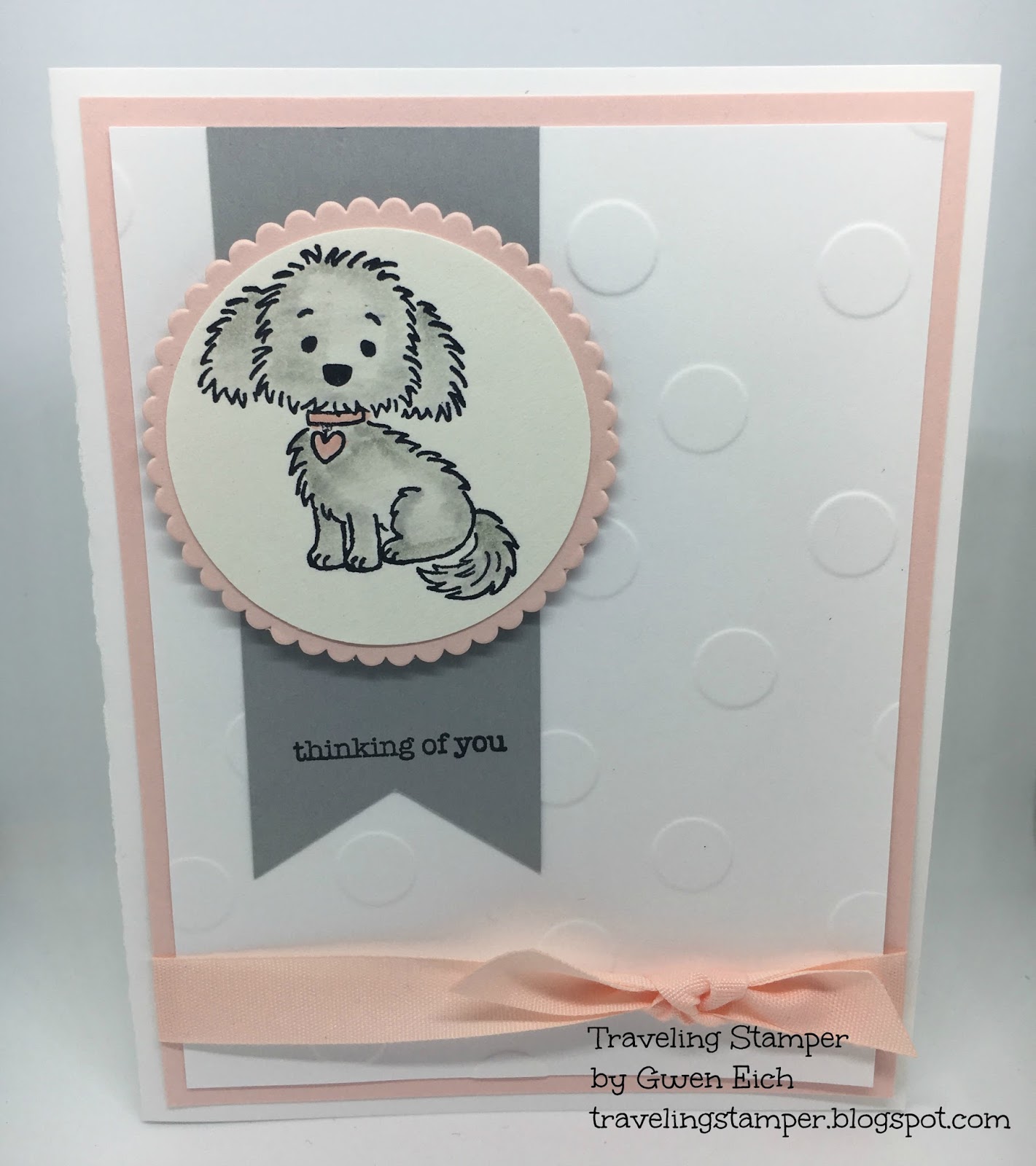 Oh my gosh, I just love this little puppy. Her name is Bella. Isn’t she the cutest? I believe this is one of the cutest puppy stamps ever created by a company. So honored and excited that Stampin UP has it. I needed a Thinking of You card and immediately thought of Bella.