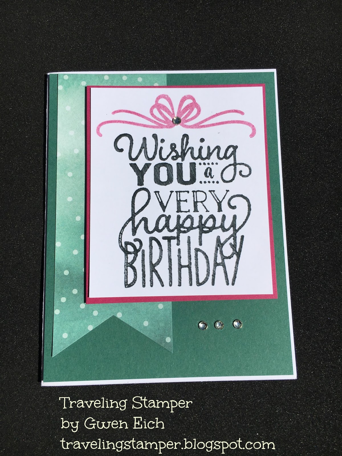 I Stamped the sentiment in Black with Berry Burst on top. Added a few rhinestones and popped the Berry Burst layer. Quick and easy!