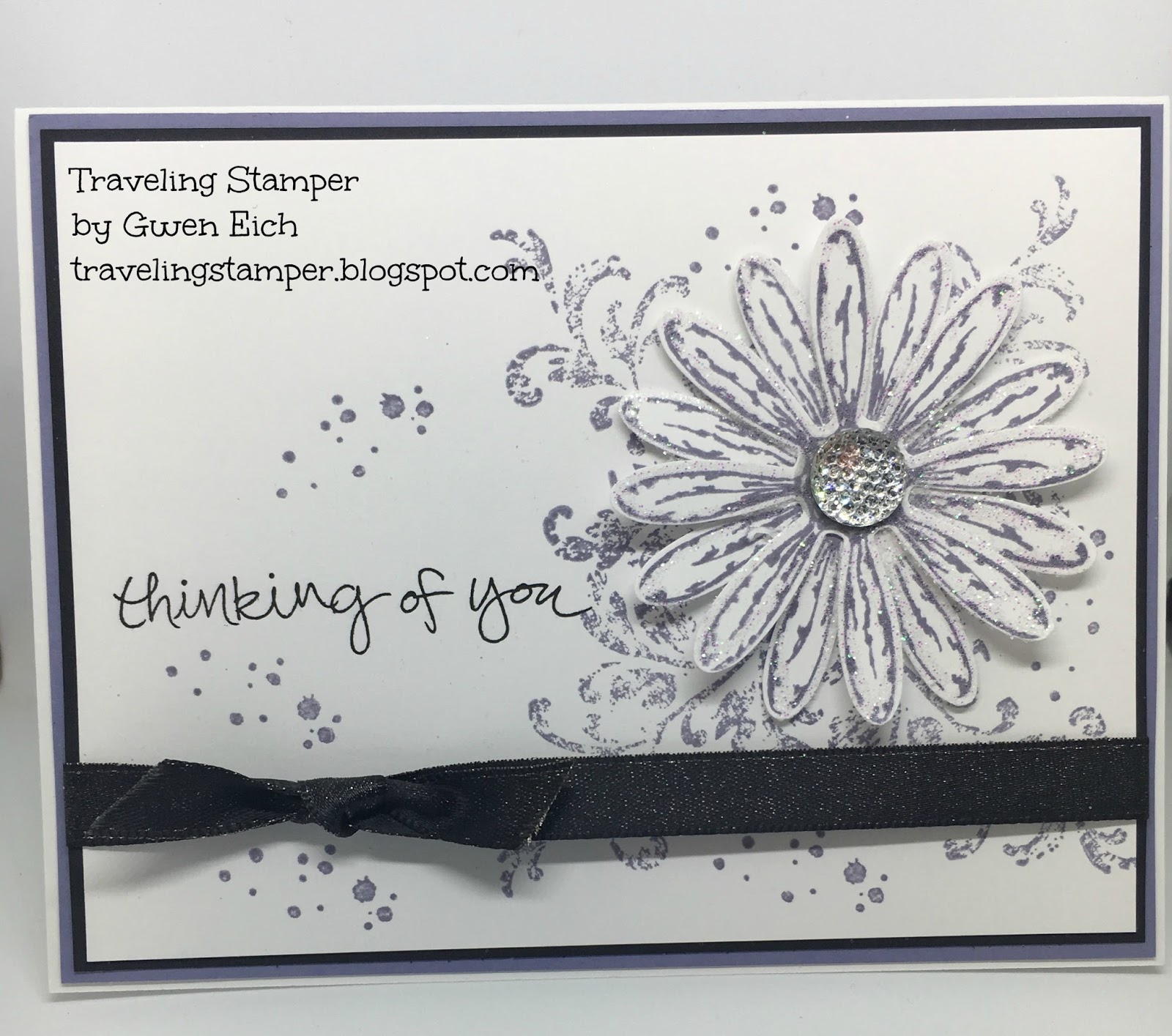 Thank you for stopping by today and checking out my card. The card today features the daisy punch and the daisy stamp. I stamped and punched two daisies to make look full. For the background set I used Timeless Textures and the thinking of you from Sheltering Tree but you could change the sentiment to what ever works for the occasion. That is what I love about stamping you can make up a bunch of blank cards and just add the sentiment for what ever kind of card you need at that time.